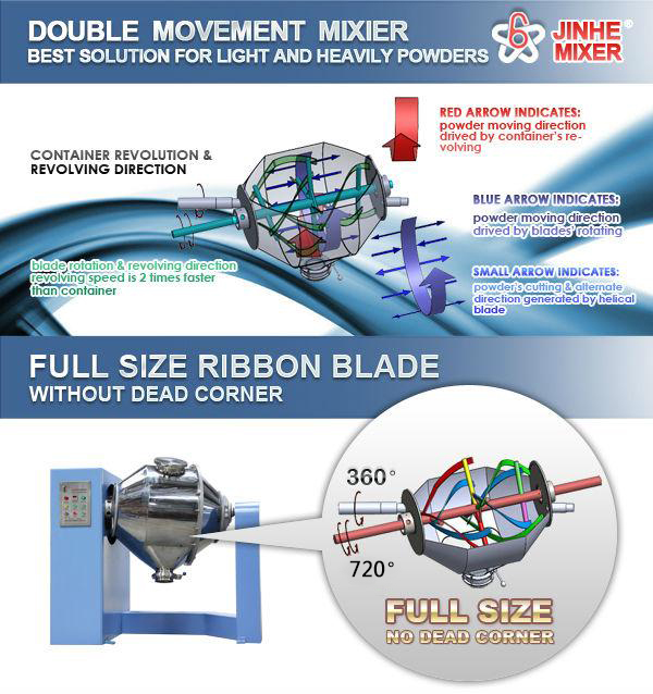 3rd This series machine has better mixing effect for powders which has big difference in specific gravity. Because the revolving helical blades inside this machine have down force to powder, floating light powder can be pressed down into the heavy powder and mixed completely.